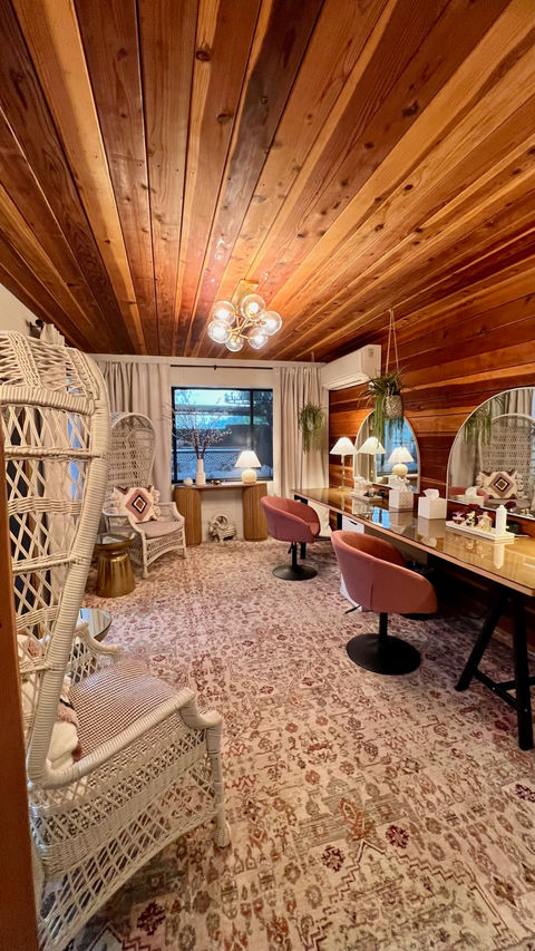 The expansive living room, defined by vaulted ceilings, flows seamlessly into a dining area for six and a dedicated workspace, while the fully equipped kitchen offers modern appliances and a curated coffee, espresso, and tea station — every creature comfort considered. A large hair and makeup studio just off the living room provides an invaluable amenity for bridal parties preparing together in style.