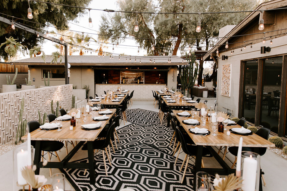 Today, this storied residence serves as a refined gathering space, perfectly suited for intimate celebrations, private dinners, creative events, and micro wedding receptions. The expansive grounds are expertly manicured and elegantly furnished, featuring a built-in bar, covered lounge with a fireplace, open-air dining hall, and gender-free restrooms — all designed to host memorable moments beneath the desert sky.